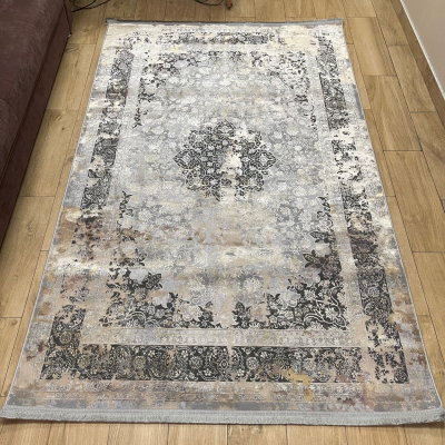 Прямоугольный ковёр Liza 6374A_BEIGE_BEIGE — элегантное сочетание кремовых, бежевых, коричневых, светло‑серых, оранжевых и золотых оттенков. Рисунок 6374A и разноуровневый ворс создают выразительную текстуру и визуальную глубину, при этом высота ворса всего 8 мм обеспечивает аккуратный, современный вид.