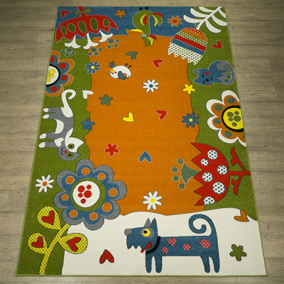 Ковёр выполнен в насыщенных и жизнерадостных цветах: оранжевом, зелёном и разноцветном. Высота ворса составляет 10 мм, что обеспечивает не только красивый внешний вид, но и приятные тактильные ощущения. Гладкий тип ворса легко чистится и идеально подходит для любой комнаты – будь то гостиная, спальня или детская.